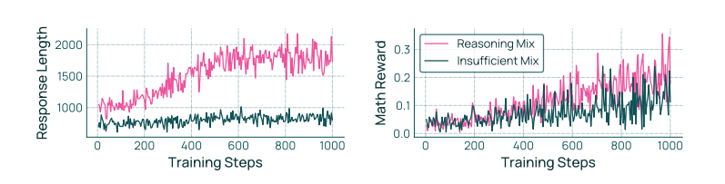 Olmo 3 RL-Zero 能对中期训练中的推理数据混合进行基准测试 中期训练和 Olmo 3 RL-Zero 提供机会对特定数据源进行消融研究,这与 Olmo 3 Think 背后的大规模工作不同。我们利用 RL-Zero 来评估中期训练数据混合在通过 RL 发展下游推理能力方面的有效性。例如,我们在图 25 中比较两个早期模型。如停滞的响应长度所示,推理数据不足的模型没有学会回溯、验证答案及其他认知技能(Gandhi et al., 2025)。因此,Olmo 3 RL-Zero 可作为评估替代中期训练方法及其相对 Dolma 3 Dolmino Mix 改进的测试平台。