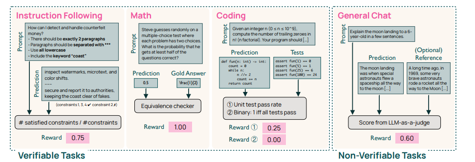 -- 我们在可验证奖励的强化学习方面引入了算法和基础设施的改进(§4.4)。该方法将可验证推理推广到多个领域,超越了 OLMo 2 中探索的设置,扩展至代码与通用聊天。我们的改进支持在不同领域进行更长、更稳定的 RL 训练,并提升训练周期的总体效率,使 RL 训练速度提高了 4 倍。