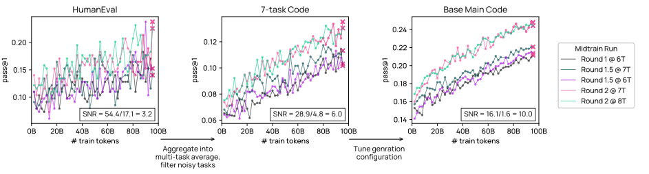 我们对中期训练重复相同分析,使用 5 次初步预训练运行的中间检查点。其中一个重要发现是将一些基准从宏观平均中分离,如 CruxEval(Gu et al., 2024a),它测量一个相关且独特的能力(代码输入/输出预测),但会向宏观平均引入过多噪声。图 7 展示了在中期训练中三个单独基准的信噪比与基础主要任务平均值的对比示例。