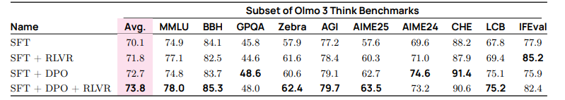 • Olmo 3 Think(§4)通过在生成最终答案之前生成扩展的思考过程来进行推理训练。为实现这一点,我们采用由监督微调(SFT)、基于直接偏好优化(DPO)的偏好微调以及可验证奖励强化学习(RLVR)组成的三阶段后训练流程。我们在这三个阶段均观察到持续的收益,展示了细致的数据策划、算法改进和基础设施工程的影响。