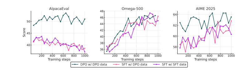 图 19 表明,以 DPO 作为 RLVR 的初始数据集效果最佳。图中展示了在 RLVR 训练过程中,使用Olmo 3 7B SFT 或 DPO 数据集作为初始数据集,分别使用经 DPO 模型过滤的数据(使用 DPO 数据集)或 SFT 模型过滤的数据(使用 SFT 数据集)进行训练时,AlpacaEval、Omega-500 和AIME2025 的性能表现。从 DPO 还是 SFT 数据集开始训练的重要性取决于具体的评估指标,但总体而言从 DPO 数据集开始训练更为理想。