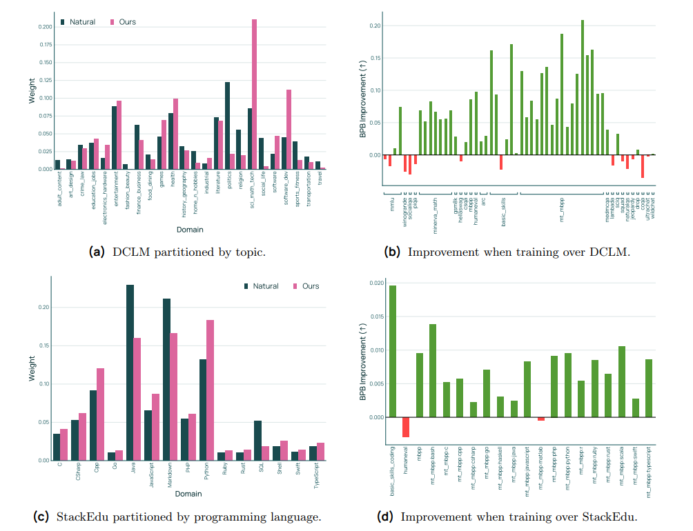 值得注意的是,提示领域分布并不总是与 pair 中表现出的对比一致,也不总是与对应下游评测领域的提升一致。例如,上采样代码提示会产生一个违反直觉的效果:代码基准性能下降(见附录表 46)。在决定最终混合时,我们基于从消融中获得的专家直觉创建了 9 份候选混合,将这些手工构造的混合与随机采样基线进行比较。我们的最终混合是经验确定的;我们发现手工构造的混合通常略优于随机采样。