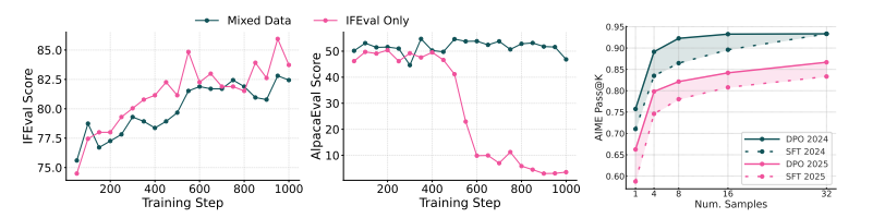 图 20 混合数据训练可防止过拟合(左图)。我们绘制了在 Olmo 3 Think SFT 7B 模型上,分别使用IFEval数据和混合数据进行强化学习训练时,IFEval和 AlpacaEval 的性能。混合数据训练在保持较高AlpacaEval 性能的同时,也获得了类似的 IFEval性能。DPO 的 pass@K性能优于 SFT(右图)。我们绘制了 SFT 和 DPO 思维模型在 AIME 2024 和2025 数据集上的 pass@K性能,K值最高可达32。即使在K值较低的情况下,DPO 的性能也始终优于 SFT。