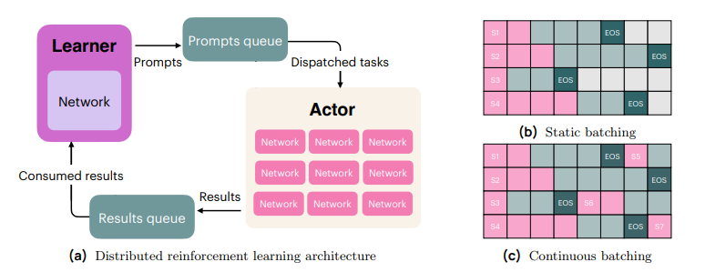 图 17(a) 分布式强化学习架构。(b,c)静态批处理与连续批处理。当选代序列长度可变时,静态批处理会浪费计算资源。粉色单元格表示预填充的标记,绿色单元格表示解码后的标记,深绿色表示序列结束(EOS)。灰色表示序列处于空闲状态,因此连续批处理会立即回填已完成的行(不会浪费计算资源)。
