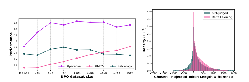 Figure 23 理想的偏好数据集规模取决于下游任务(左)。AlpacaEval 和 ZebraLogic 的性能会随数据量增加而提升,直到大约 75--100K 样本,此后进一步扩展数据规模会带来负面影响或无收益。相比之下,AIME2024 在 AlpacaEval 和 ZebraLogic 开始出现性能下降的点之前并未达到饱和。因此,为在所有下游任务之间取得理想平衡,我们在训练期间将数据集规模作为超参数进行扫描。未过滤的偏好数据表现出长度偏置(右)。分布中有显著部分呈现"选择回答"长于"拒绝回答"。例如,GPT 评判数据的 token 差异在第 80 百分位处为 538 个 token,delta-learning 启发式对的该数值为 564 个 token。