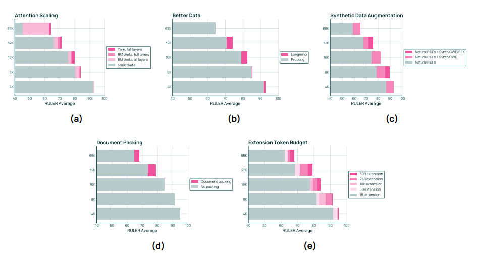 Long-context extension(§3.6) 我们在 Dolma 3 Longmino Mix 上进行训练,包含 50B / 100B tokens,将长文档与中期训练数据结合。我们使用 256 个 H100 进行训练。4 长上下文扩展需要特殊的训练考虑,我们在 §3.6 中详细说明。