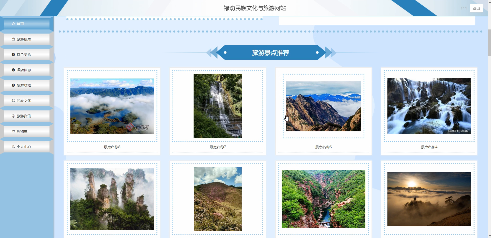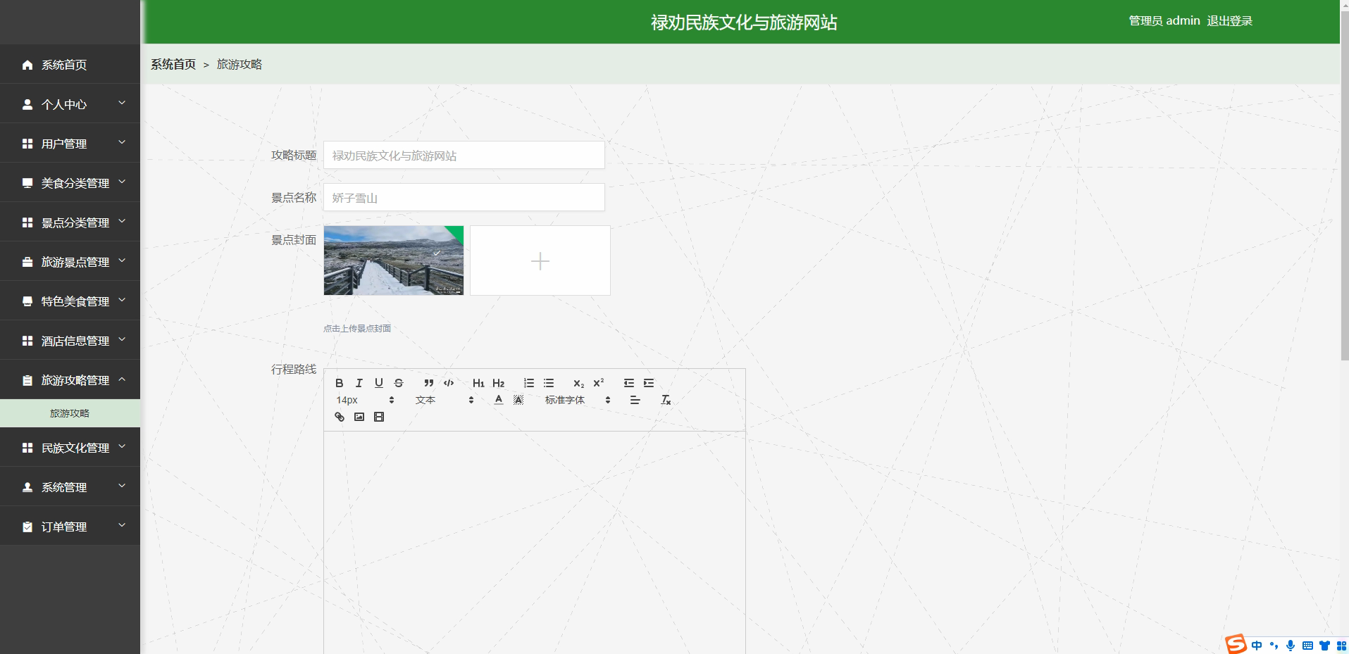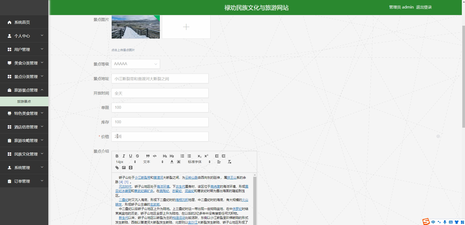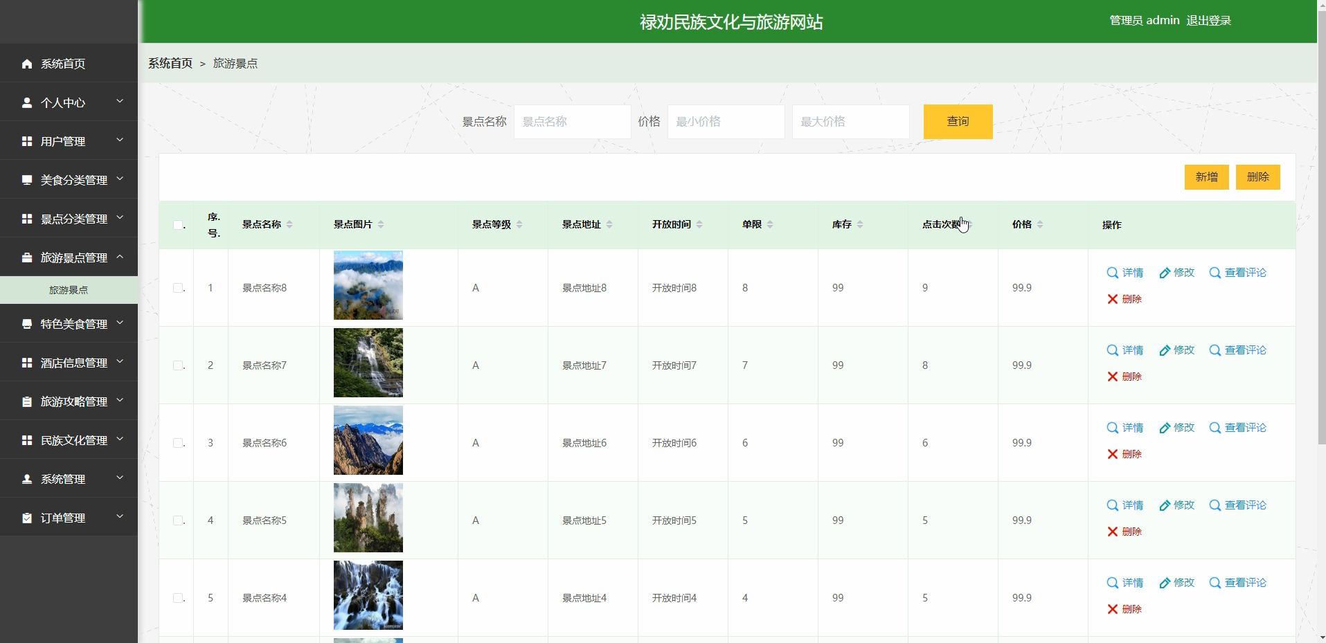 - 系统管理模块:支持管理员对用户信息、民族文化内容、旅游资源数据进行增删改查操作,确保系统数据准确性与安全性。