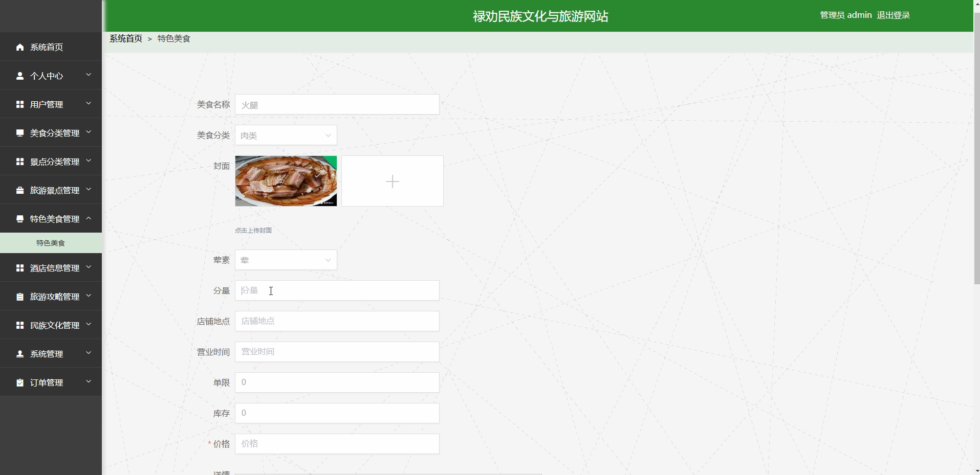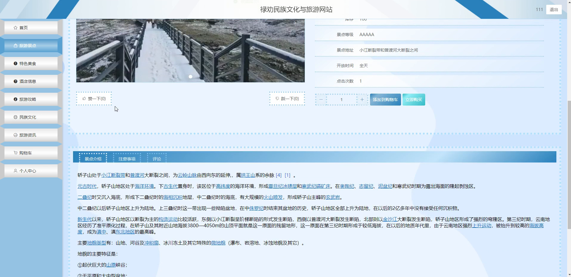 - 旅游资源推广模块:整合禄劝景点、美食、酒店等资源,提供详细信息查询与在线预订服务。例如,景点模块支持开放时间、门票价格、交通指南等信息的实时更新。
