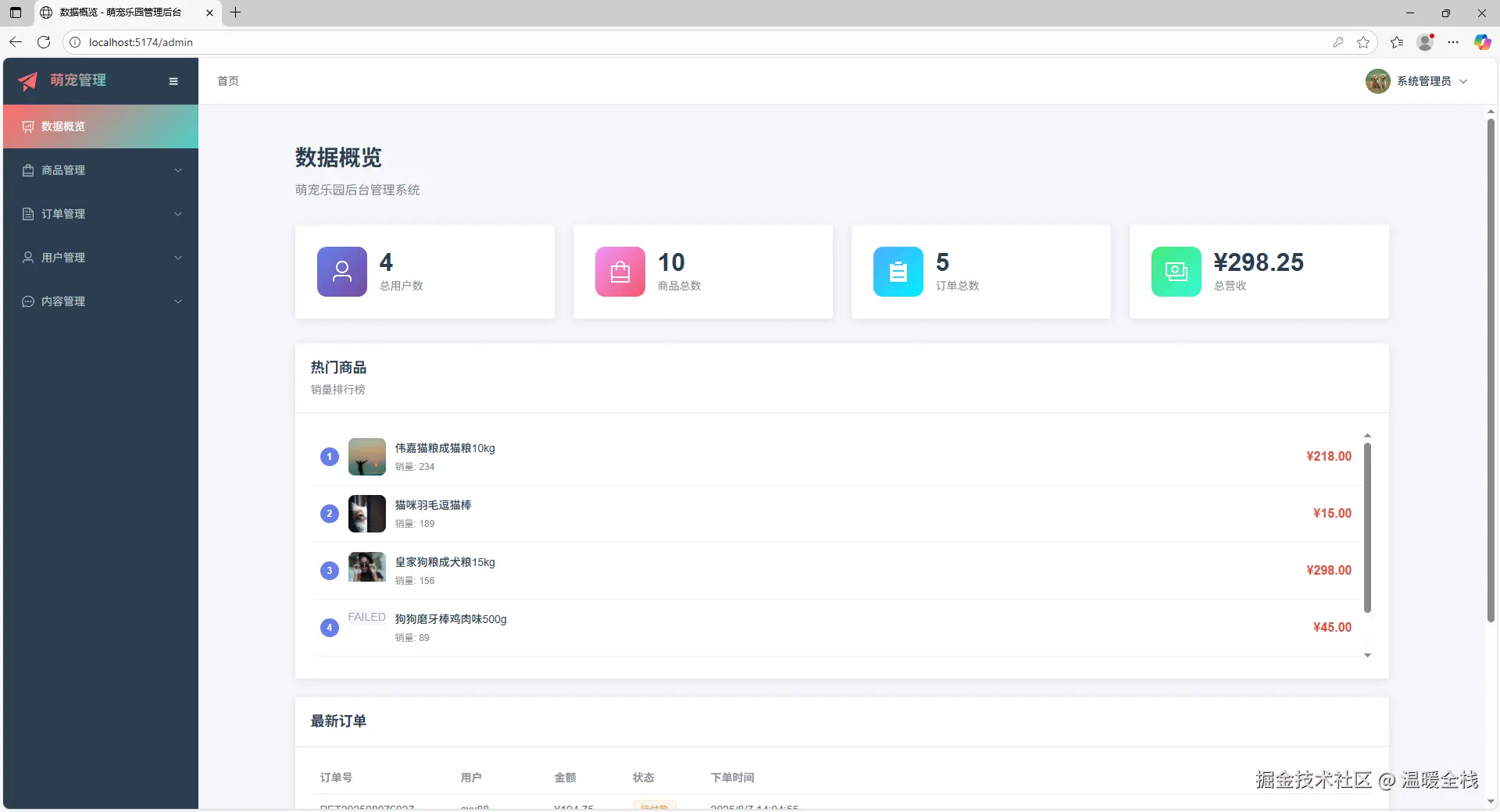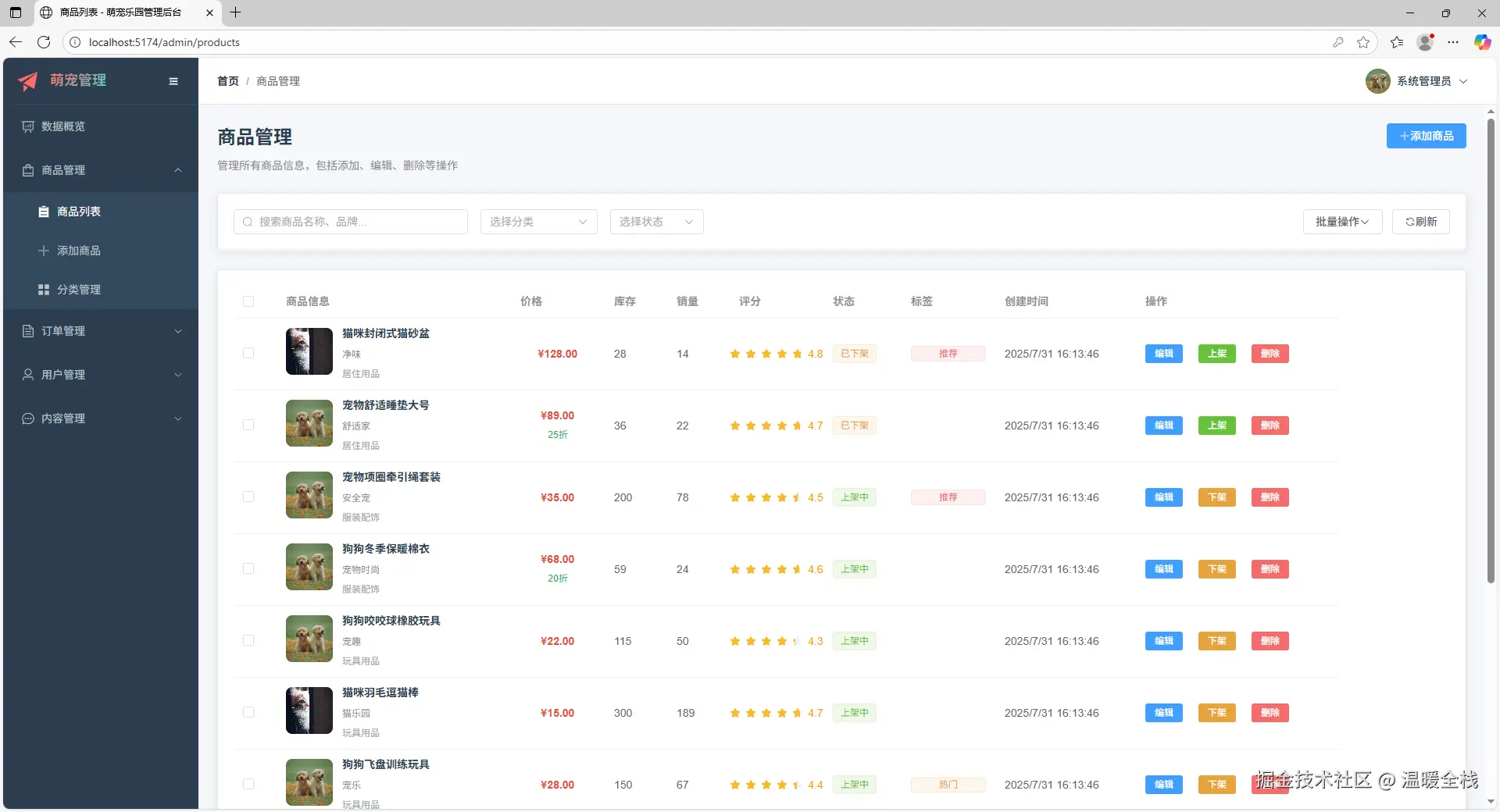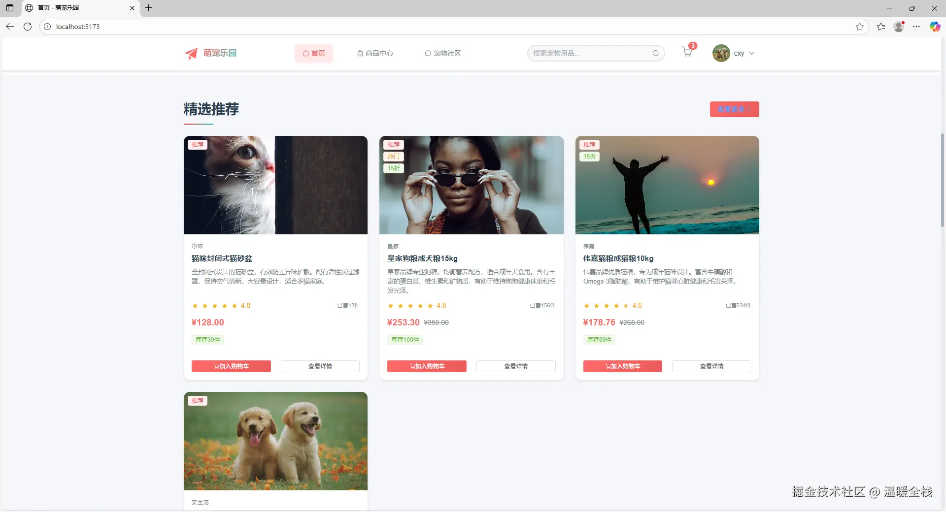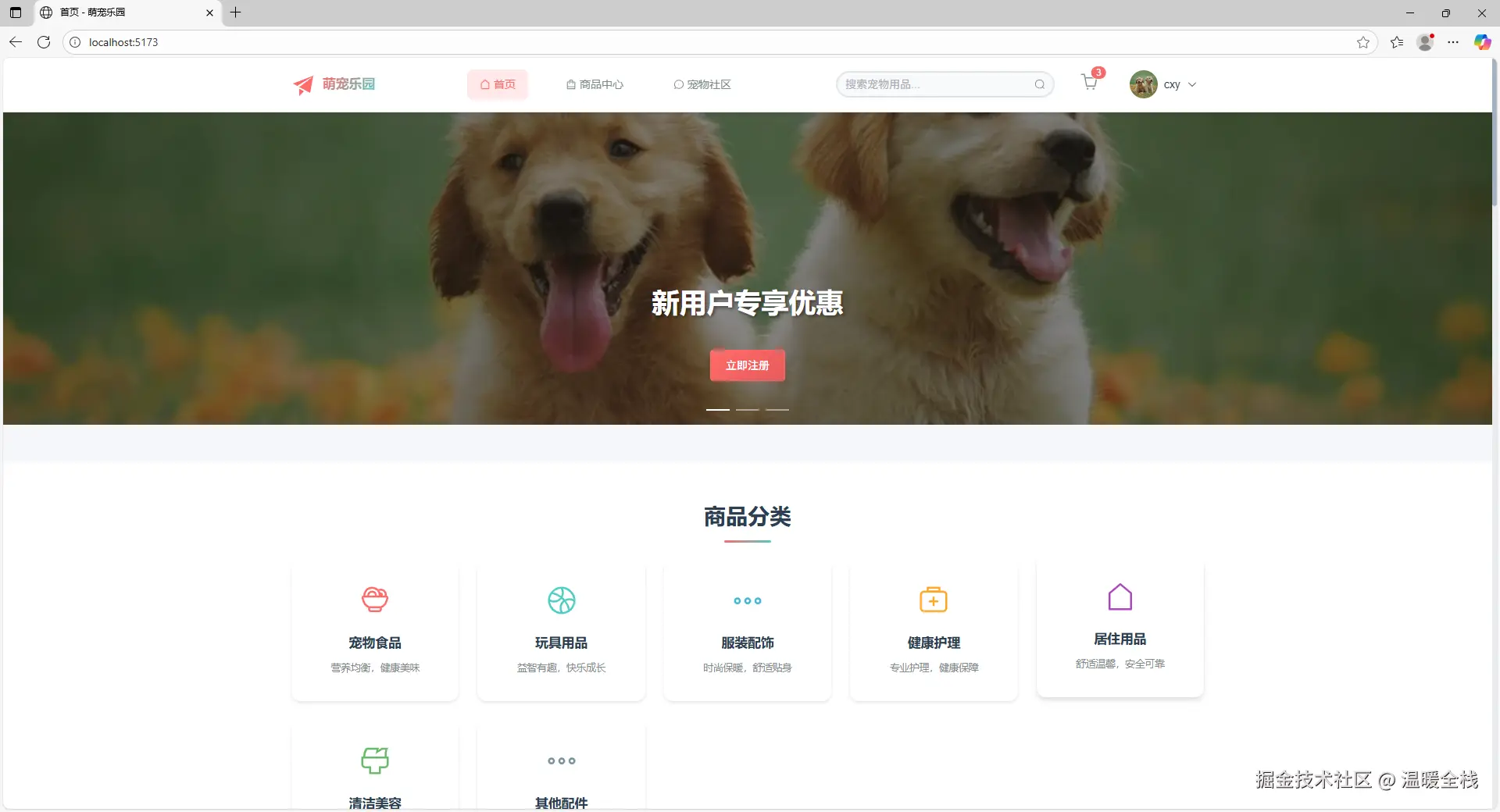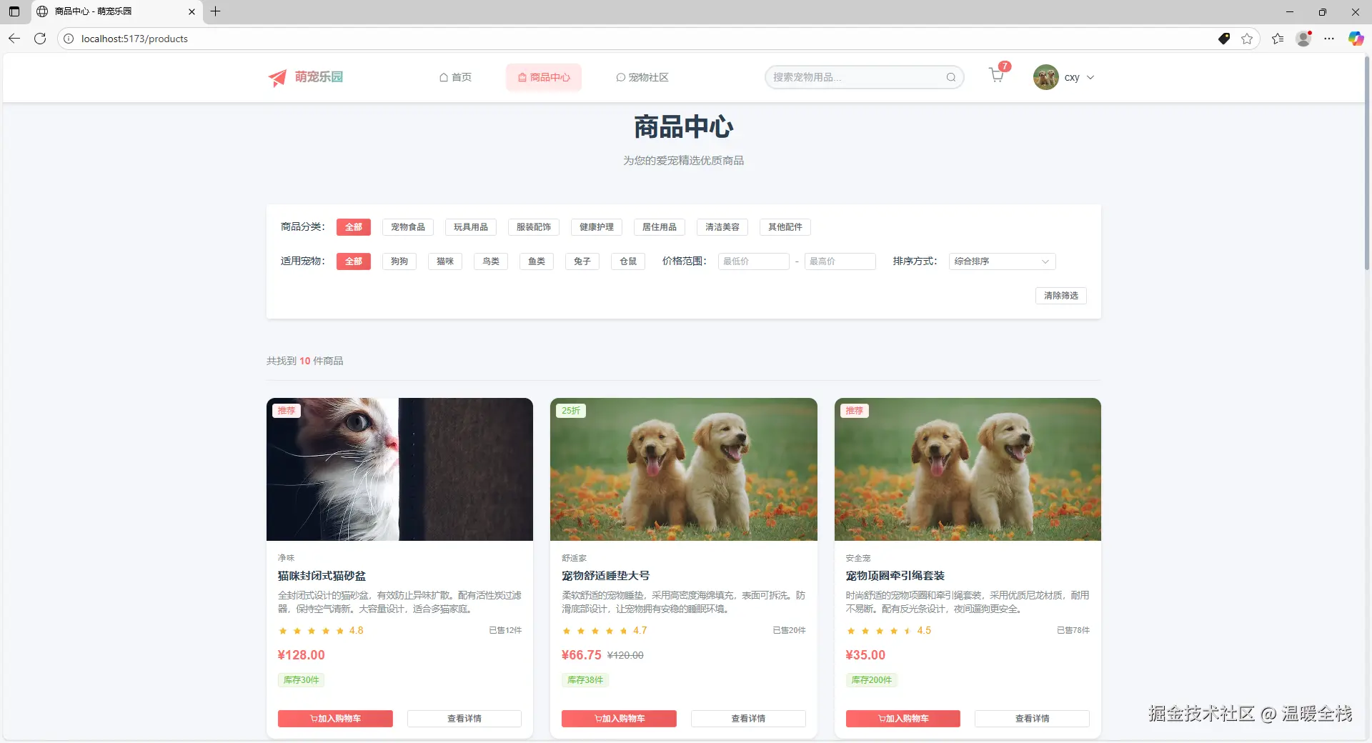 随着互联网技术的快速发展和宠物经济的持续升温,宠物用品电商平台已成为宠物主人购买宠物用品的主要渠道。设计并实现了一个基于Vue3和Node.js的全栈宠物用品购物系统,该系统采用前后端分离架构,包含用户购物系统和后台管理系统两个子系统。
