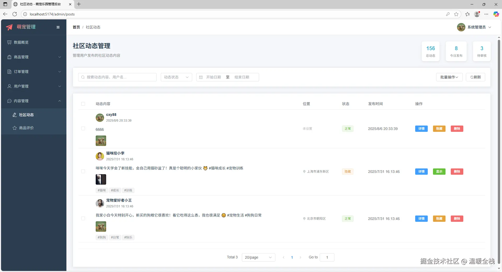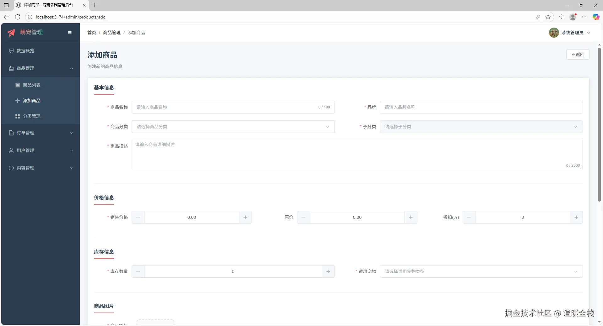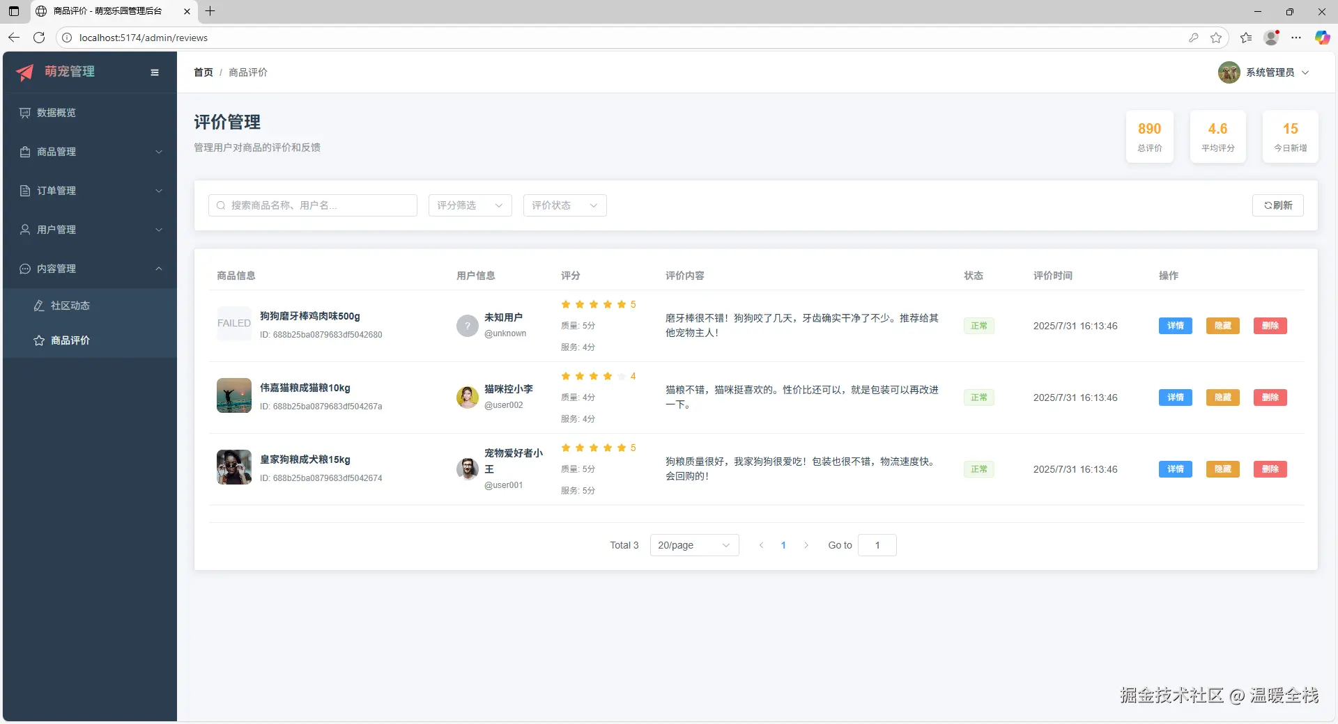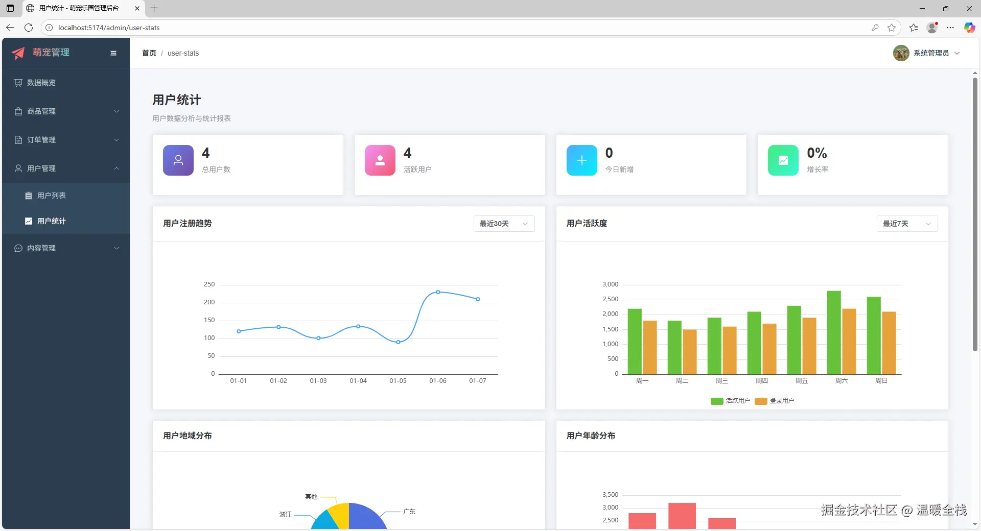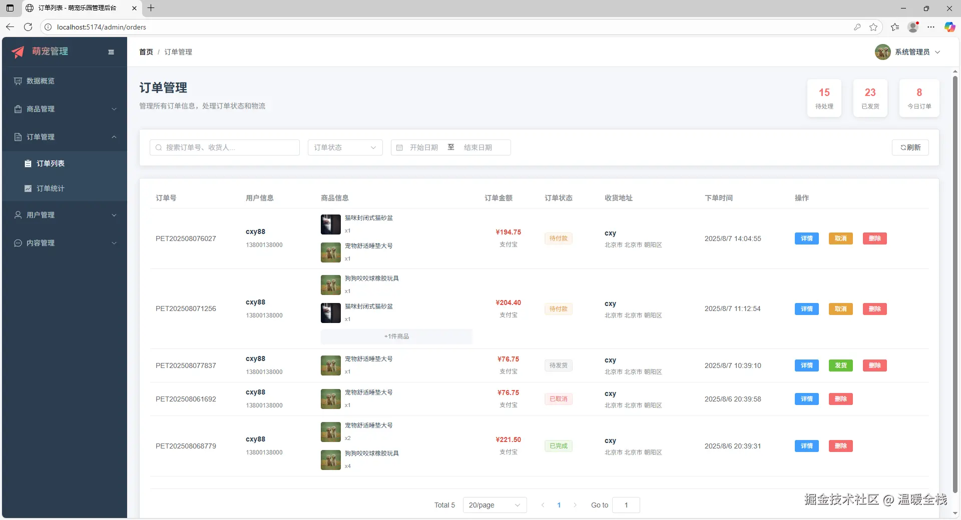 随着互联网技术的快速发展和宠物经济的持续升温,宠物用品电商平台已成为宠物主人购买宠物用品的主要渠道。设计并实现了一个基于Vue3和Node.js的全栈宠物用品购物系统,该系统采用前后端分离架构,包含用户购物系统和后台管理系统两个子系统。