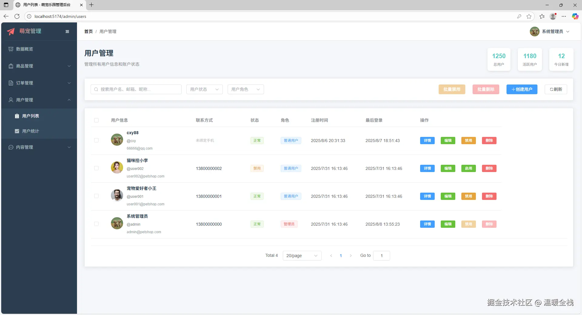 - ✅ 4个测试用户(1个管理员 + 3个普通用户)