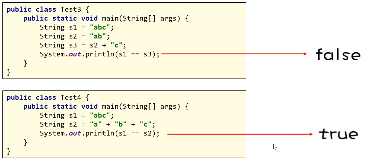 在Test3中,s3是通过s2与"c"进行运算得到,结果开辟在新的堆内存中,而s1通过双引号创建存储在常量池中,因此s3与s1地址不同。