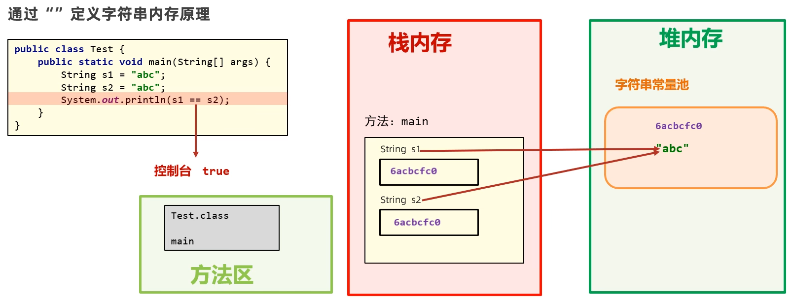 通过双引号直接创建的字符串对象,会在堆内存中的字符串常量池存储。即双引号创建的字符串对象被视为固定常量赋值给变量,如果再通过双引号创建一个相同的字符串对象,那么存储的位置相同,其地址也相同。用于节约内存。