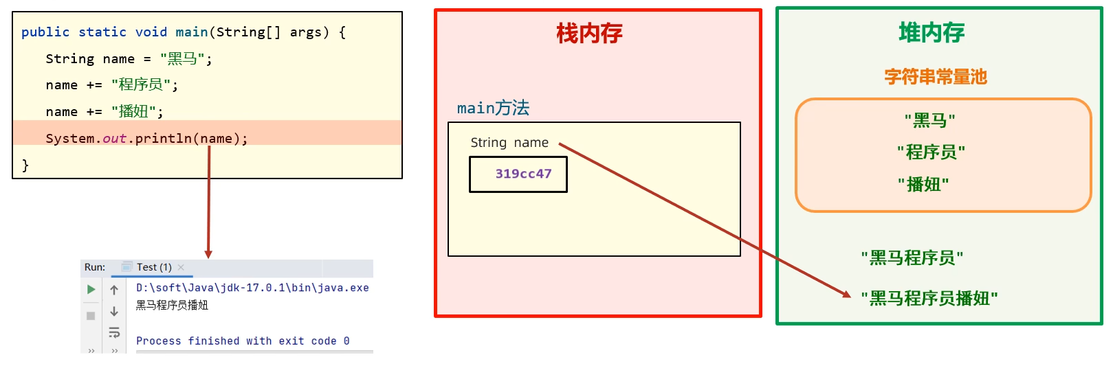 - [3.new String创建的字符串对象存储在堆内存中,内容相同但地址不同](#3.new String创建的字符串对象存储在堆内存中,内容相同但地址不同)