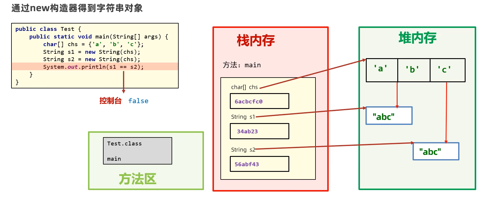 // 3.new String创建的字符串对象存储在堆内存中,内容相同但地址不同