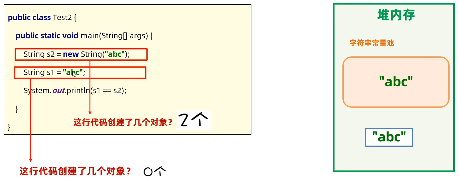 s2先创建了一个常量存储到堆内存的常量池中,然后new String方法又创建了一个内容相同但地址不同的字符串对象到堆内存中。之后的s1通过双引号生产字符串对象相当于从堆内存的常量池中直接获取到"abc"对象,因此没有创建新的字符串对象。