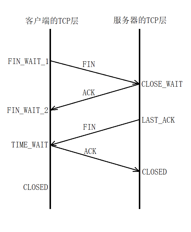 当服务器也没有数据要发送时也会调用close()并向客户端发送FIN报文并把状态设为LAST_ACK(这时服务器已经不能向客户端发送应用数据了)。客户端收到后返回一个确认应答并把状态设为TIME_WAIT,过一段时间后变为CLOSED。服务器收到后状态立即变为CLOSED。