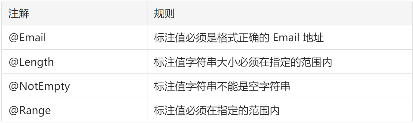 JSR 303 只是一套标准,需要提供其实现才可以使用。Hibernate Validator 是 JSR 303 的一个参考实现,除支持所有标准的校验注解外,它还支持以下的扩展注解: