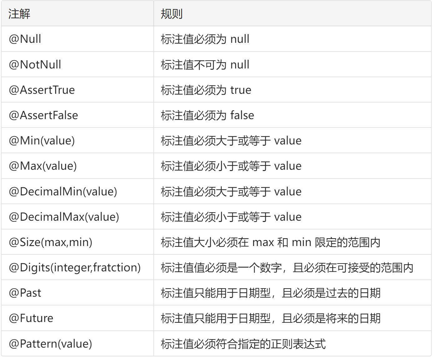 JSR 303 是 Java 为 Bean 数据合法性校验提供的标准框架,它已经包含在 JavaEE 6.0 标准中。JSR 303 通过在 Bean 属性上标注类似于 @NotNull、@Max 等标准的注解指定校验规则,并通过标准的验证接口对Bean进行验证。