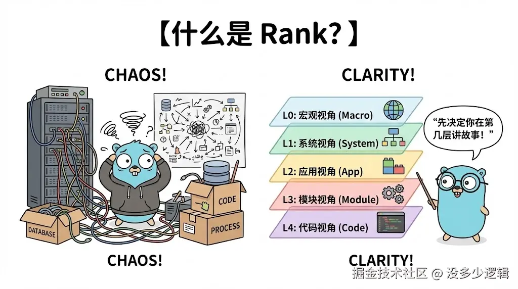 Rank 指的是架构图和讨论的"观察层级",比如:企业级、系统级、服务级、模块级或代码级。它回答的核心问题是:"你现在是在看大地图(宏观),还是在看街道图(细节)?