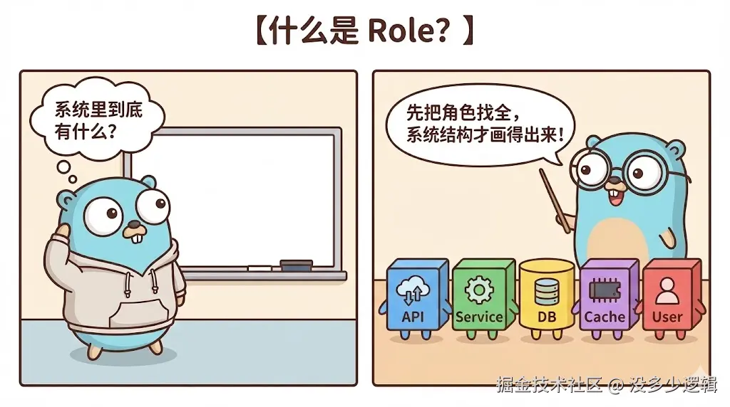 若不确定 Role,架构图就无法表达"系统本质由什么组成"。这会导致粒度混乱(有的画太大,有的画太细),也无法清晰界定系统的边界和职责。