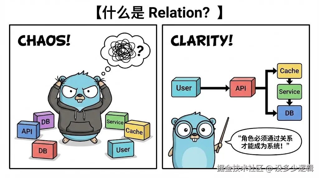 没有 Relation,架构图只是一堆散落的积木,看不出系统如何运作,也无法理解依赖链条,容易遗漏关键的交互细节(如错误处理、链路失败等)。