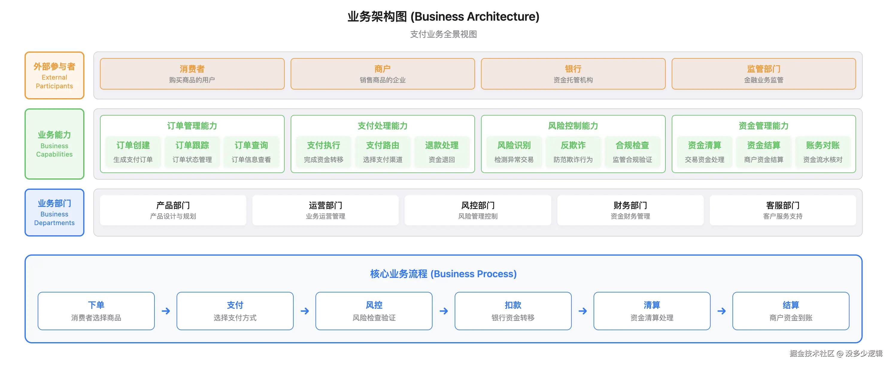 - Role (角色):业务能力(如订单管理能力、支付能力)、业务部门、外部参与者(用户、商家)。