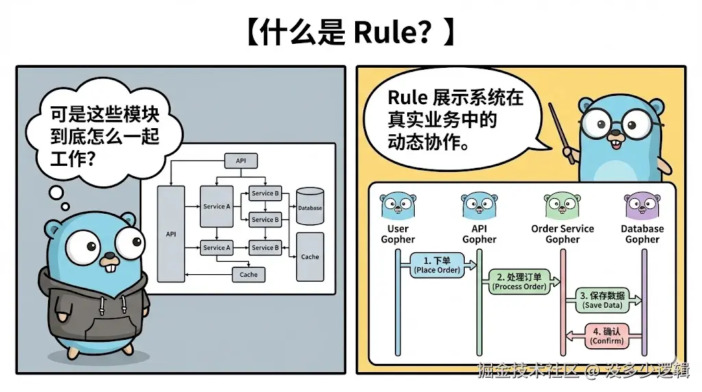 Rule 是系统的"动态视图",通常用序列图或流程图表示。它展示了在特定业务场景下(如下单流程),请求是如何流转的、谁先发消息、怎么处理错误以及业务如何闭环。