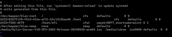 /media/Kylin-Server-V10-SP3-2403-Release-20240426-arm64.iso /media/cdrom iso9660 defaults 0 0