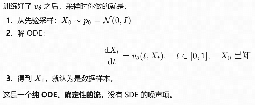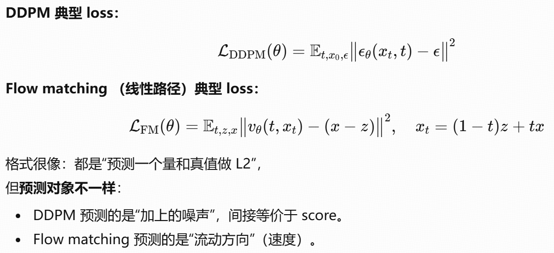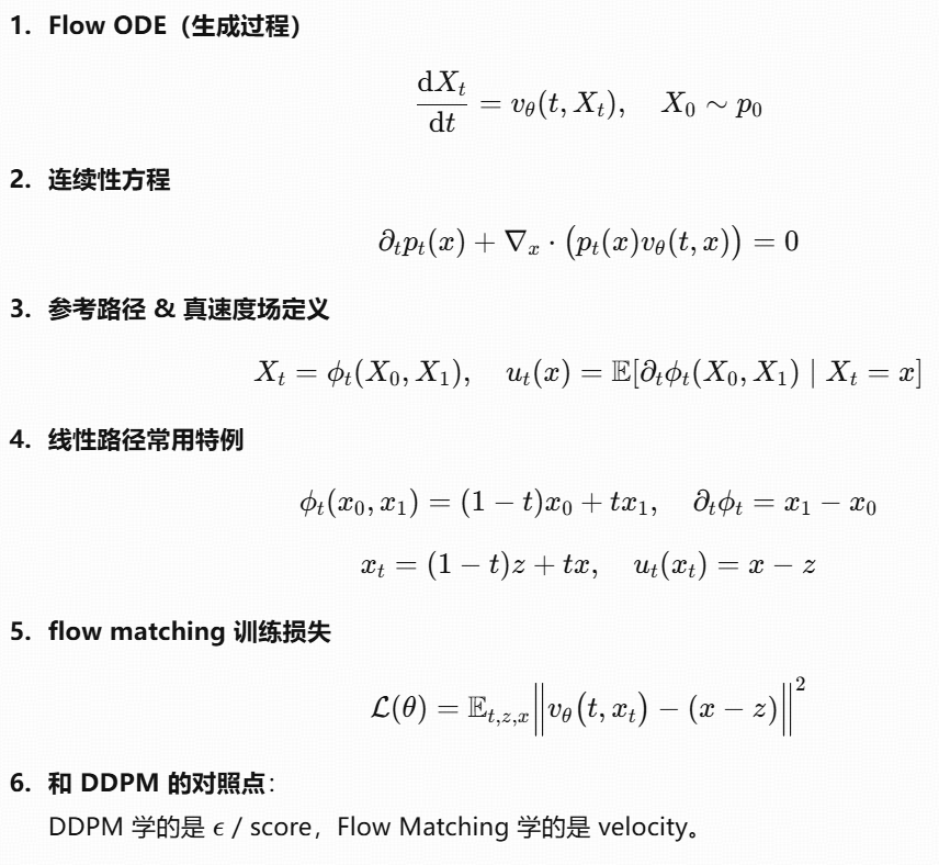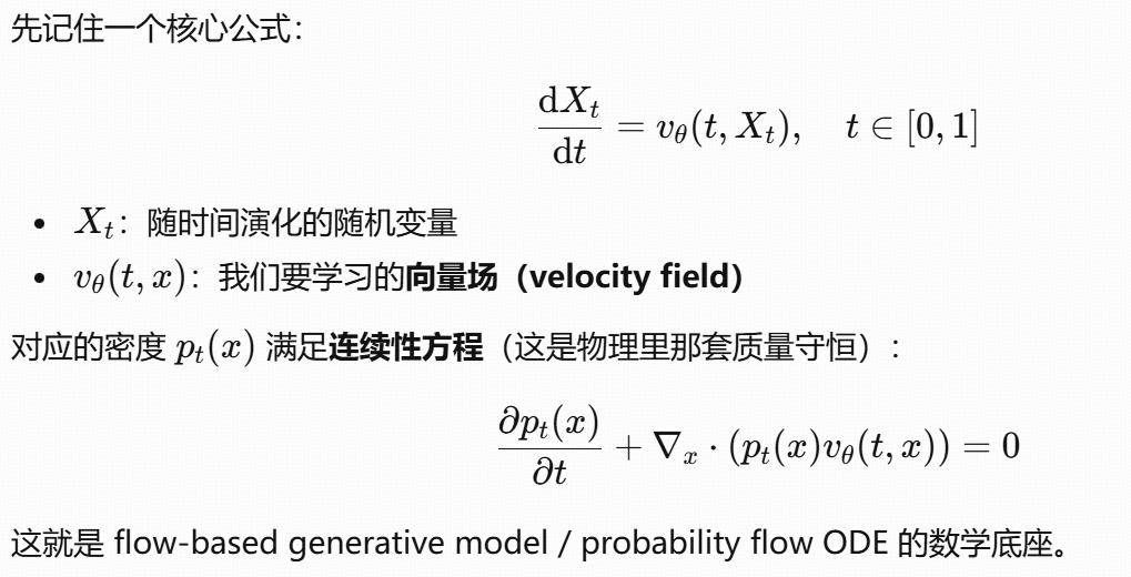 Flow matching :直接用一个常微分方程(ODE) ,学的是速度场(vector field),把"该往哪边流"拟合出来。