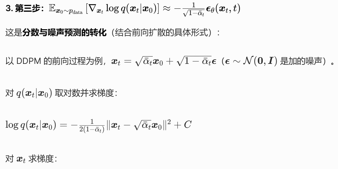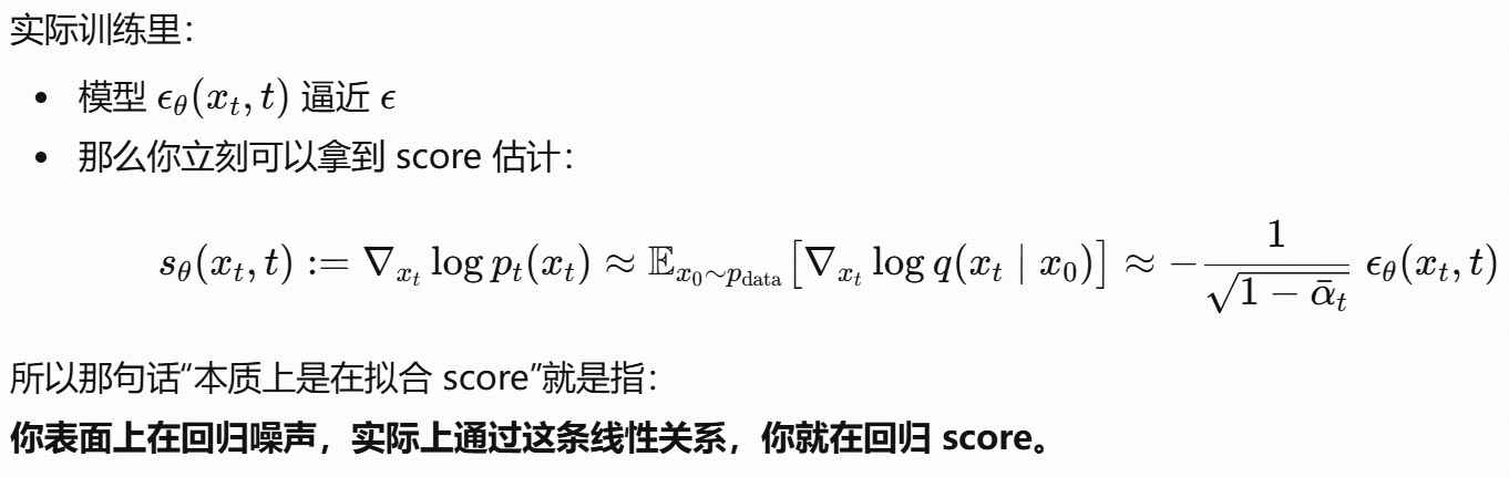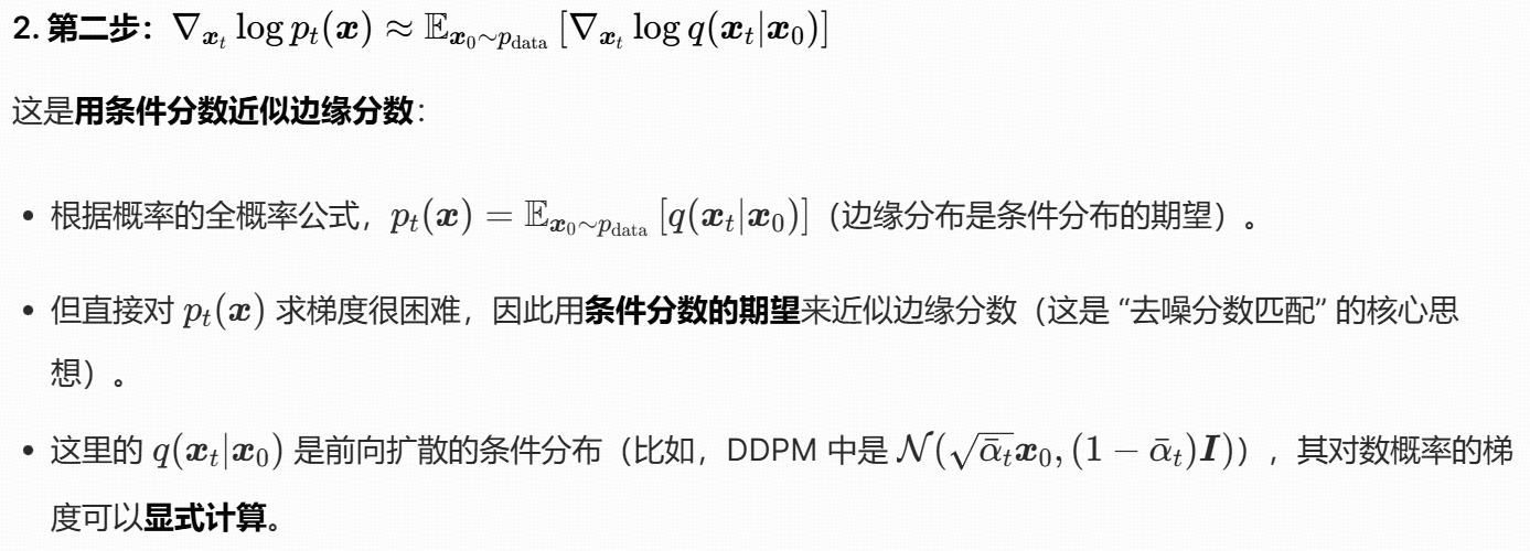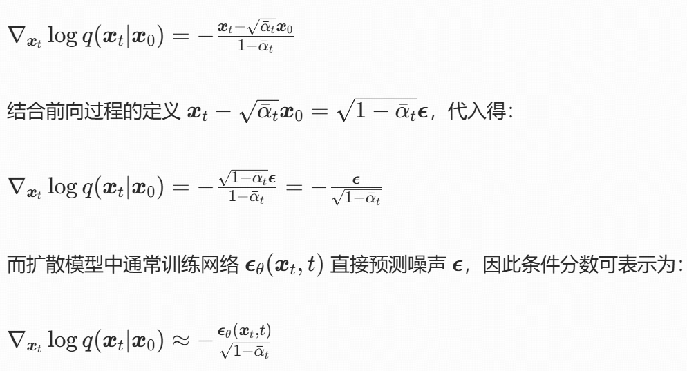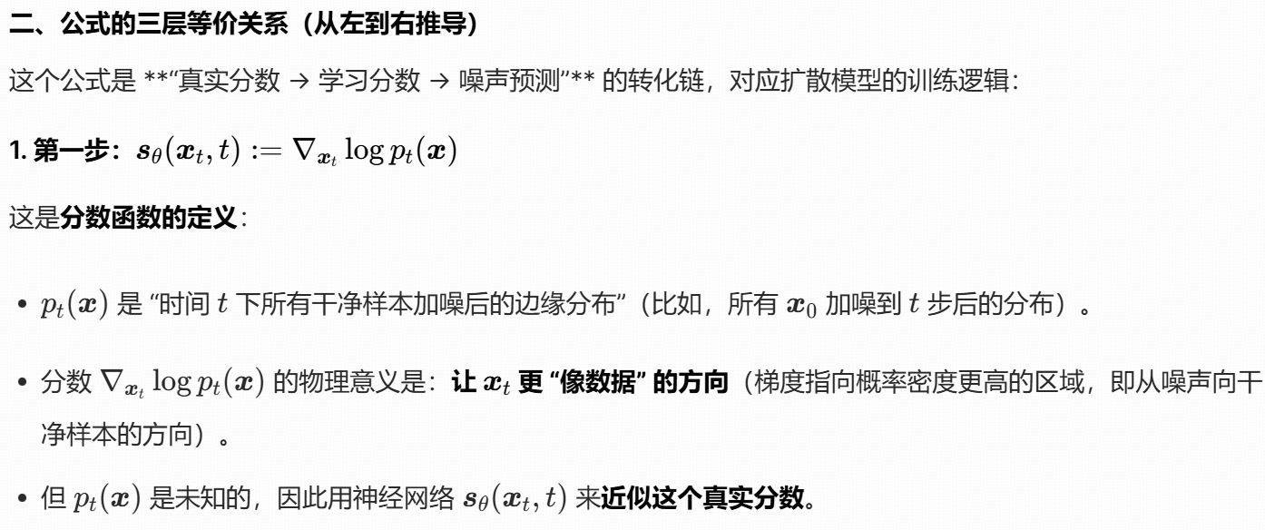 这个公式的本质是:用 "噪声预测网络" 间接学习 "分数函数",从而将 "难以计算的边缘分数" 转化为 "可训练的噪声预测任务",最终实现扩散模型的反向去噪过程。