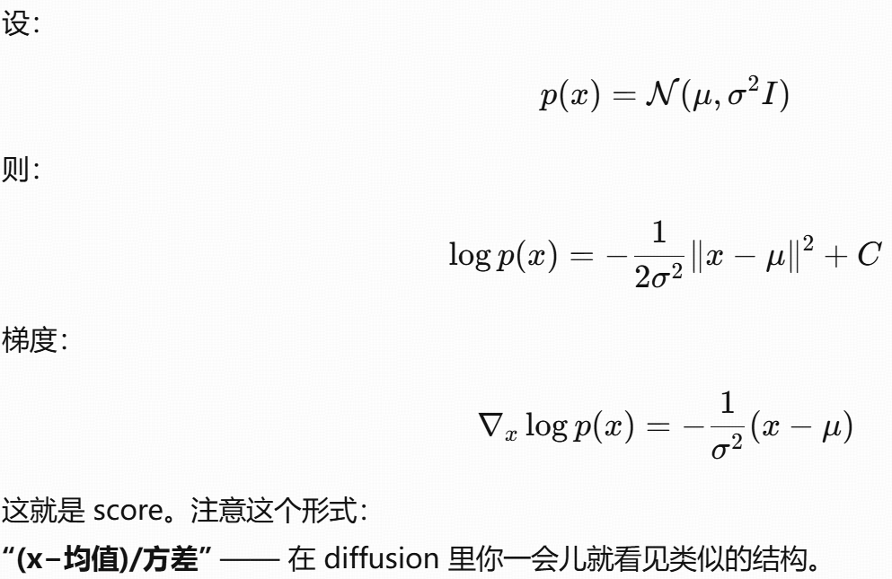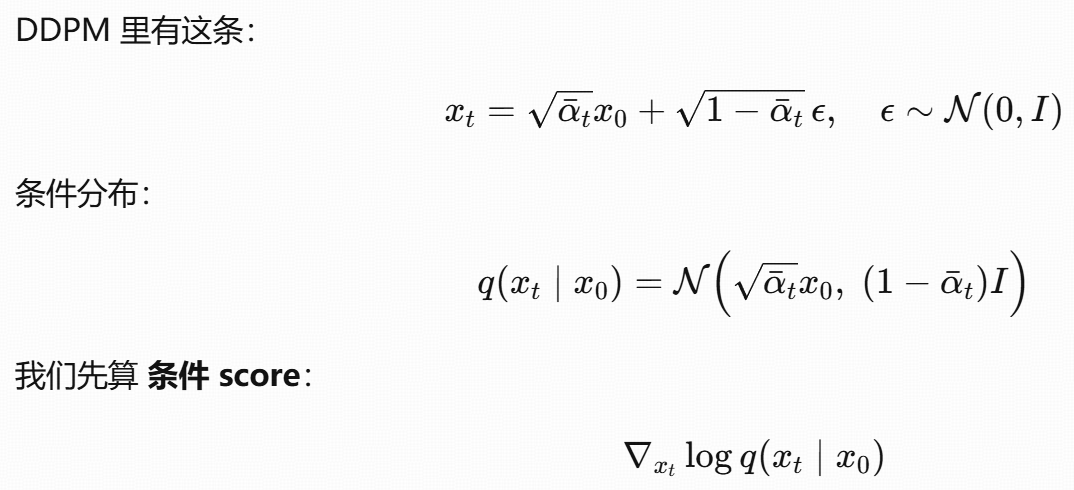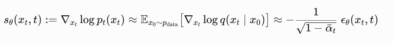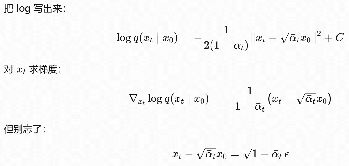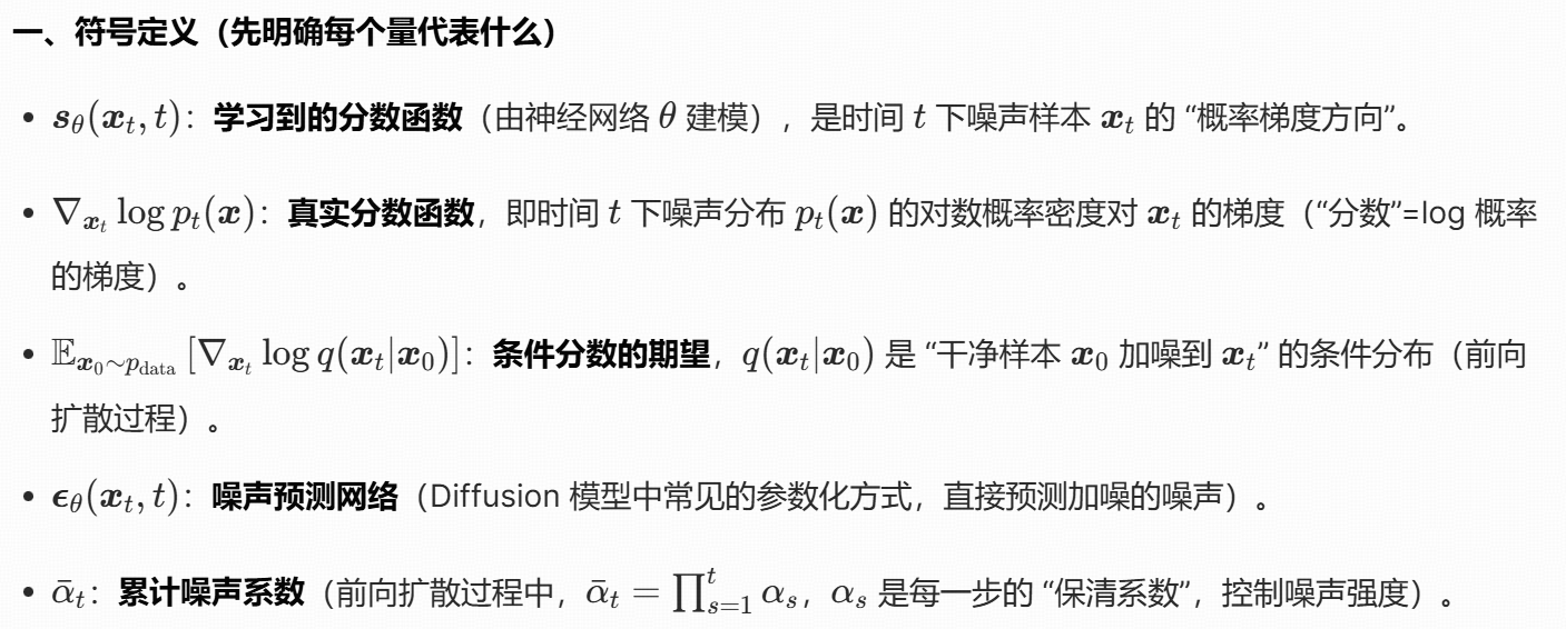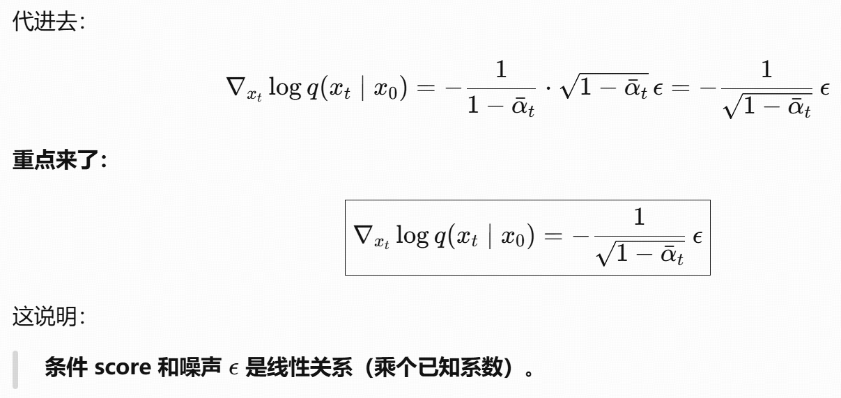 这个公式的本质是:用 "噪声预测网络" 间接学习 "分数函数",从而将 "难以计算的边缘分数" 转化为 "可训练的噪声预测任务",最终实现扩散模型的反向去噪过程。