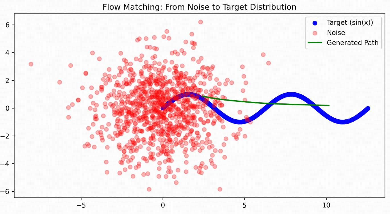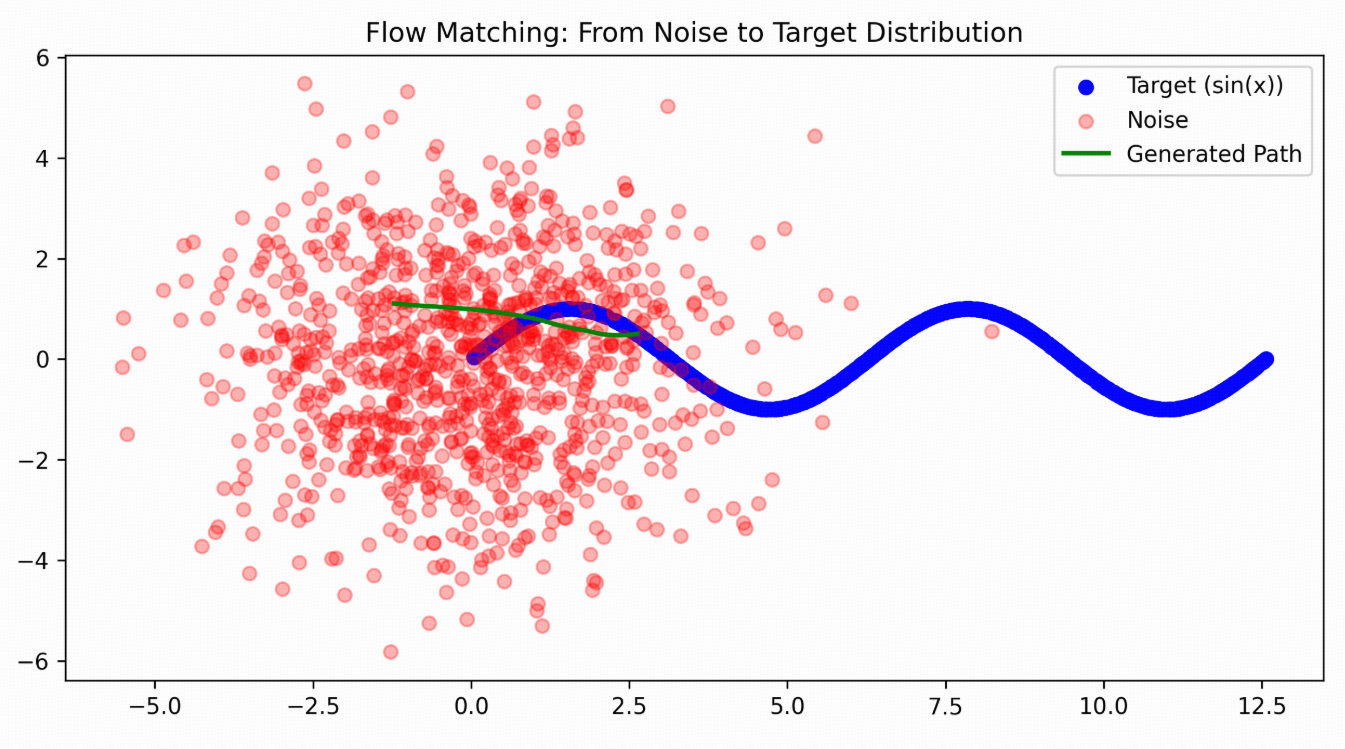 plt.title("Flow Matching: From Noise to Target Distribution")