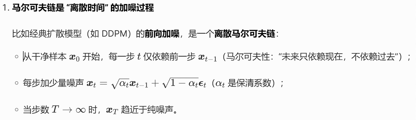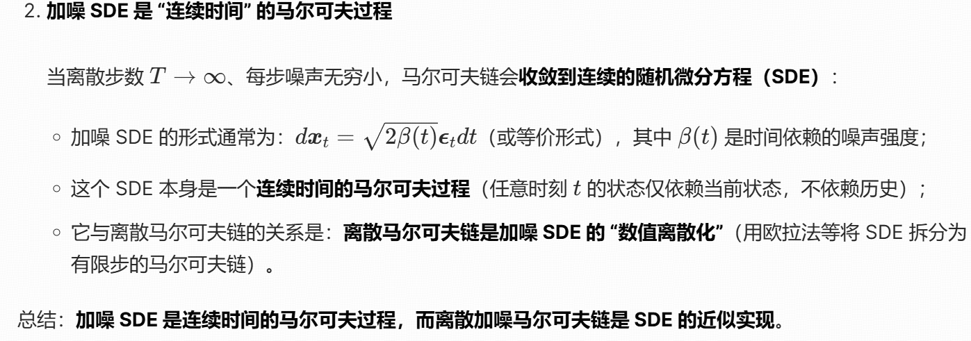加噪 SDE(随机微分方程)和马尔可夫链是连续 - 离散的对应关系,核心是描述 "数据逐步加噪的过程":