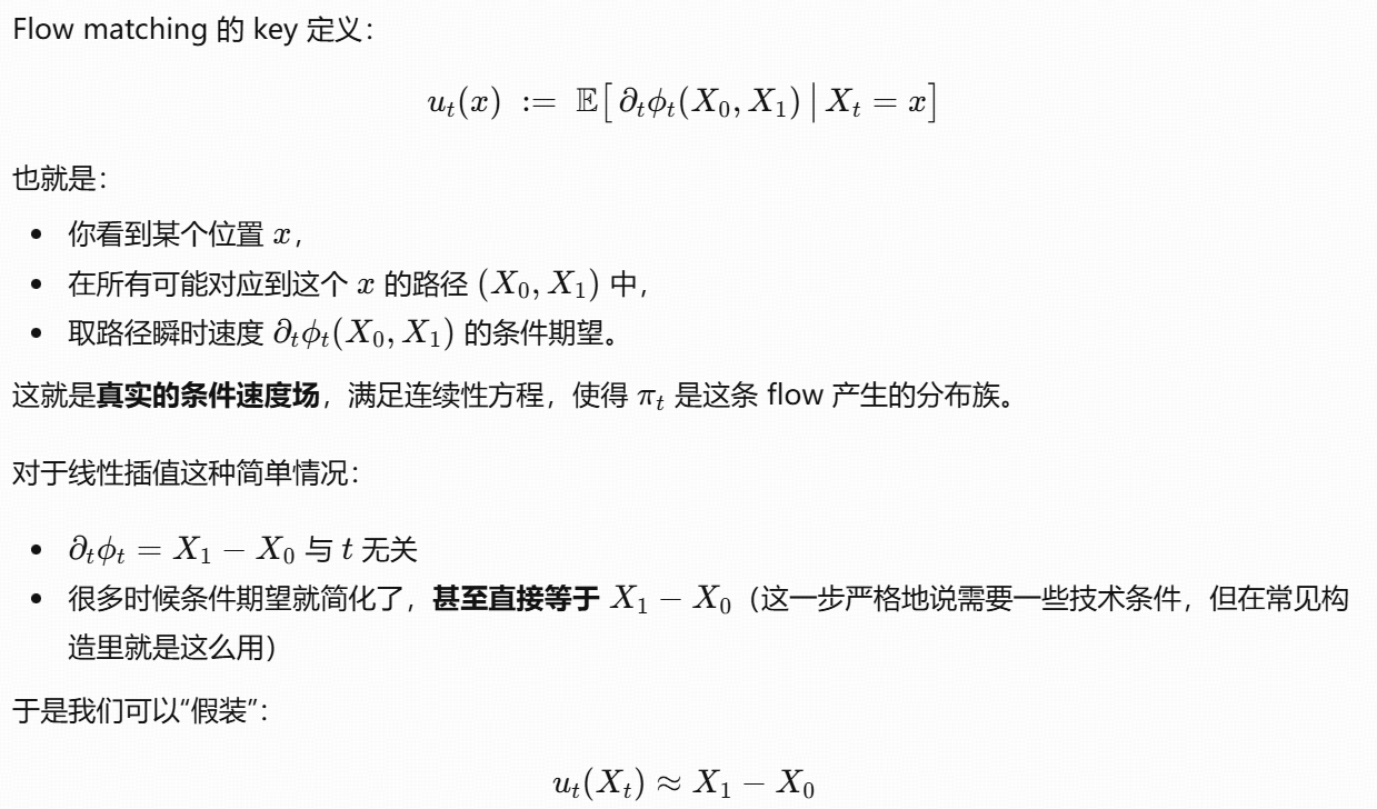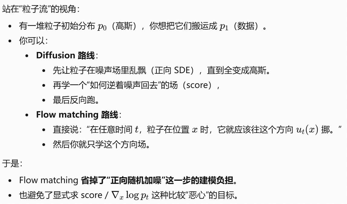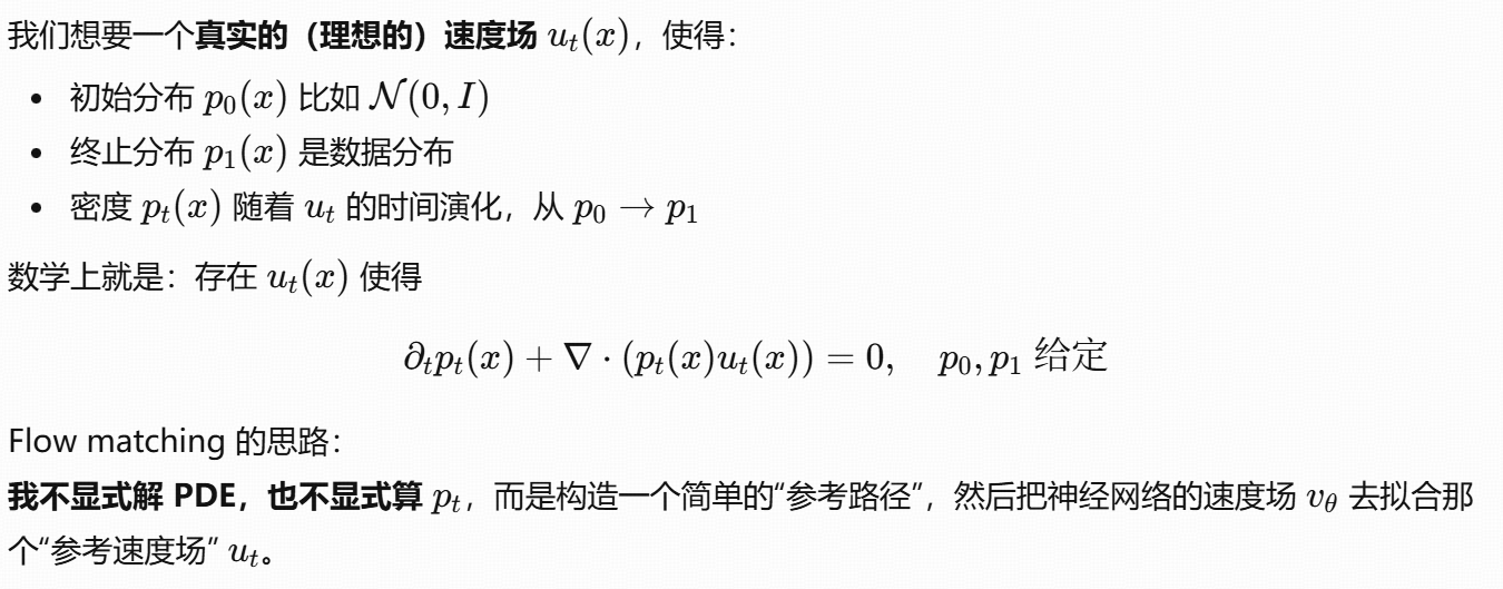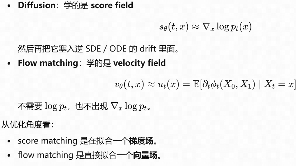 总结:flow matching 就是直接学"点在这个时间点应该朝哪个方向流动",而不是学 score。