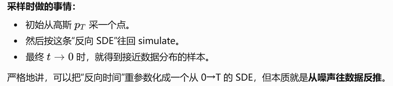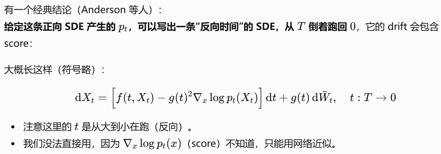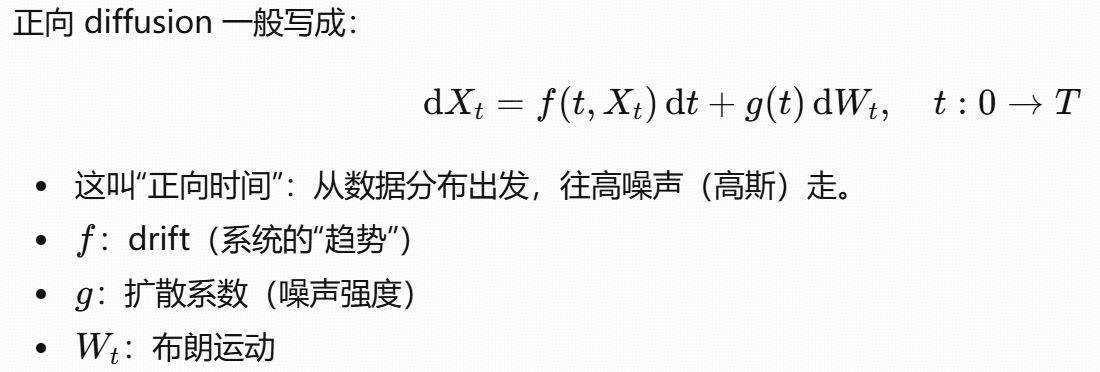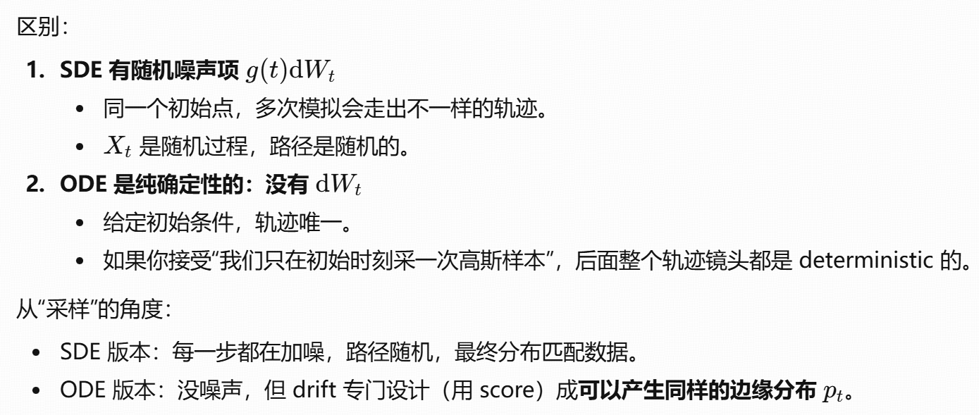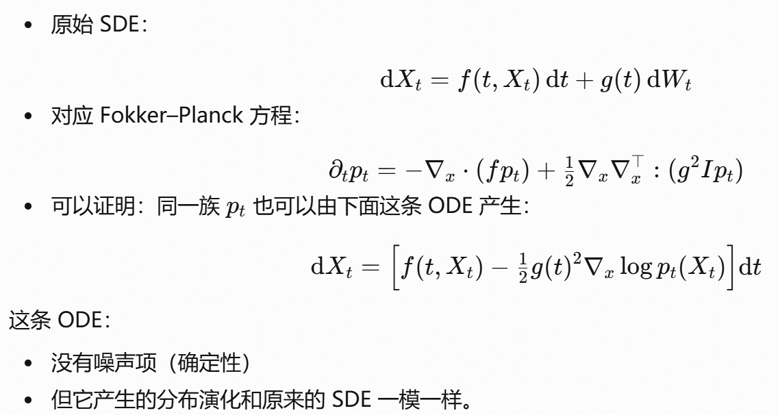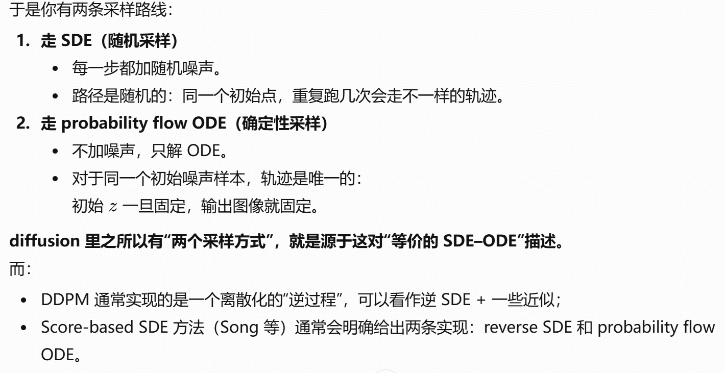 Diffusion :用的是随机微分方程(SDE) / 反向 SDE / probability flow ODE ,学的是 score field。