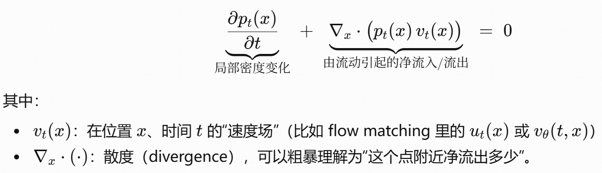某点的概率密度随时间变多/变少 = 从周围流入/流出的概率质量。写成数学就是:本地变化 + 净流出 = 0。