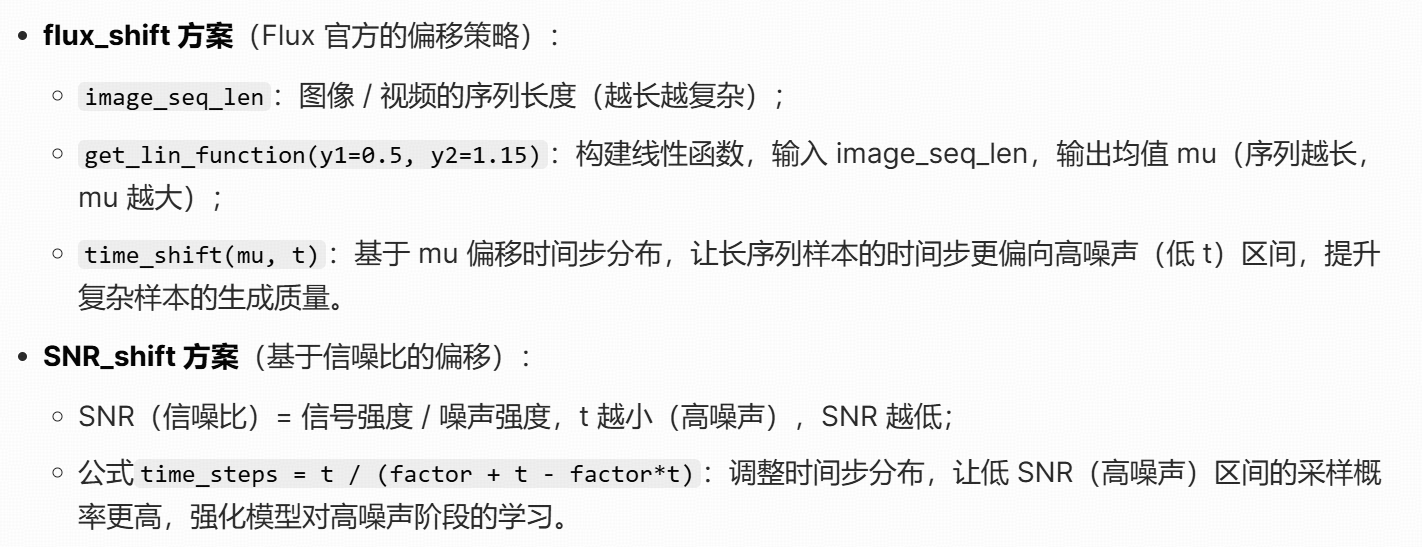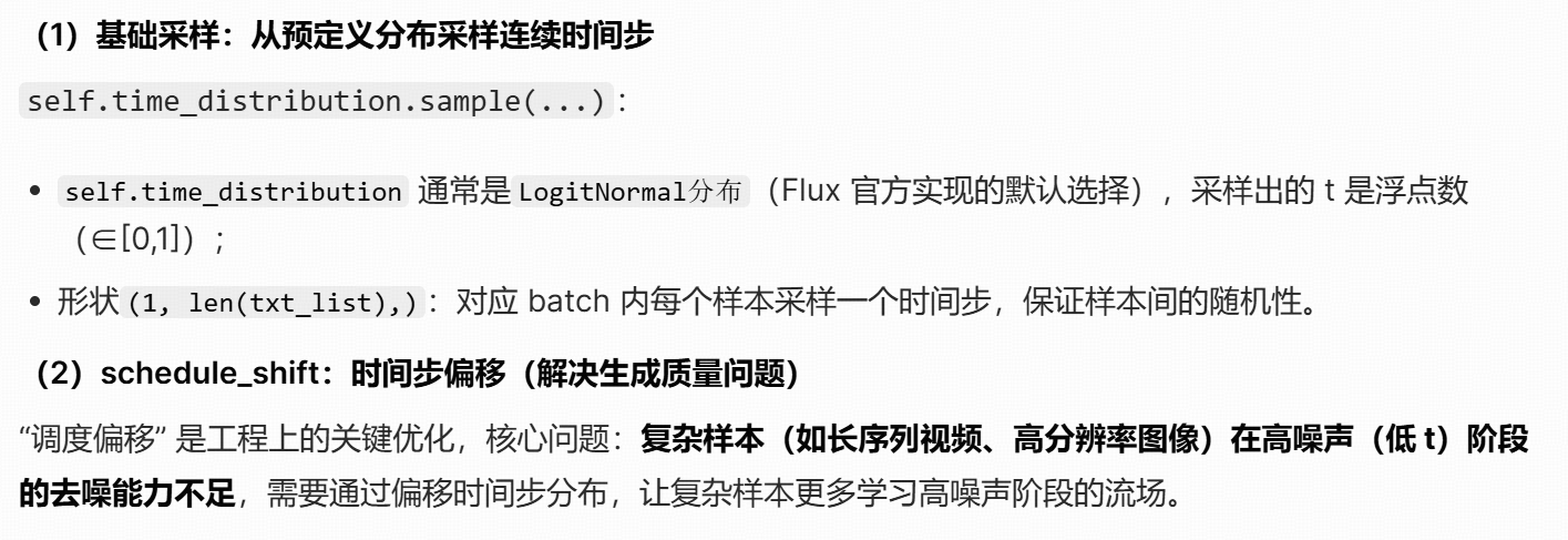 | Flow | 连续浮点数 | 分布采样 + 调度偏移 | 连续流场需贴合 logitnormal 分布,偏移强化复杂样本的高噪声阶段学习 |