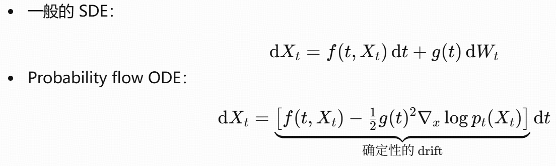 给定一条 SDE,其边缘分布 pt 也可以由一条确定性的 ODE 产生 ,这条 ODE 就是probability flow ODE。