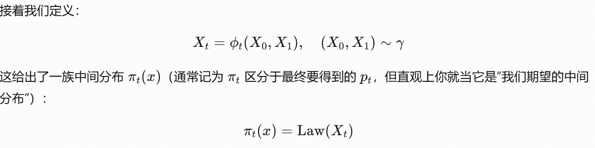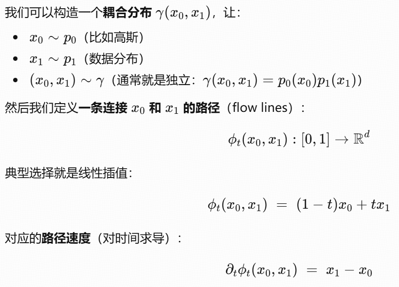 定义从初始点 x0(t=0)到目标点 x1(t=1)的线性插值:xt=(1−t)x0+tx1