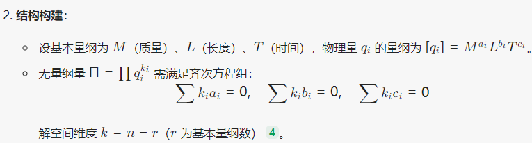* 无量纲量 Π=∏qiki 需满足齐次方程组:∑kiai=0,∑kibi=0,∑kici=0 解空间维度k=n−r(r 为基本量纲数)。