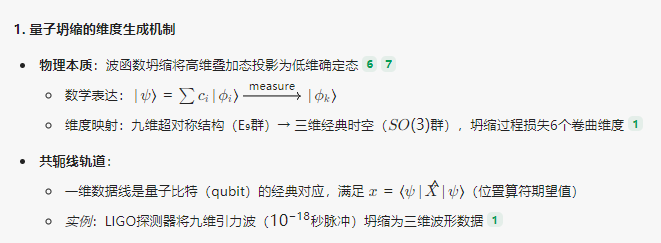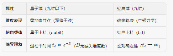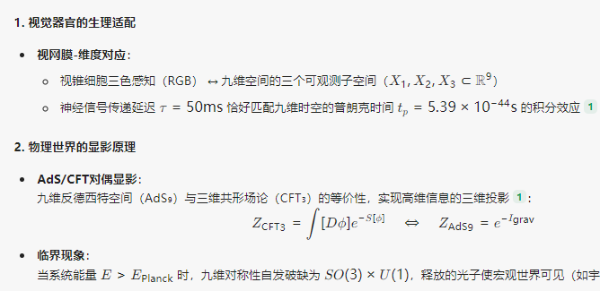- 九维空间理论:九维是宏观显现的基准维度,九维以下为量子坍缩(介观),九维以上为电子跃迁(微观)。