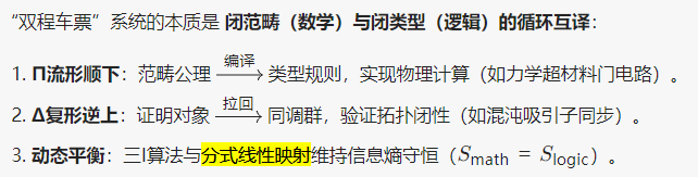 1. **Π流形顺下**:范畴公理 →编译编译 类型规则,实现物理计算(如力学超材料门电路)。