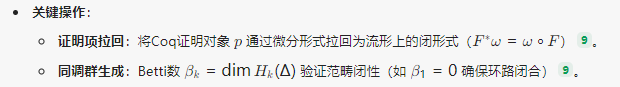 * **证明项拉回**:将Coq证明对象 p 通过微分形式拉回为流形上的闭形式(F∗ω=ω∘F )。