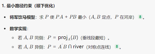 * **将军饮马模型**:求 P 使 PA+PB 最小(A,B 定点,P 在河岸)。