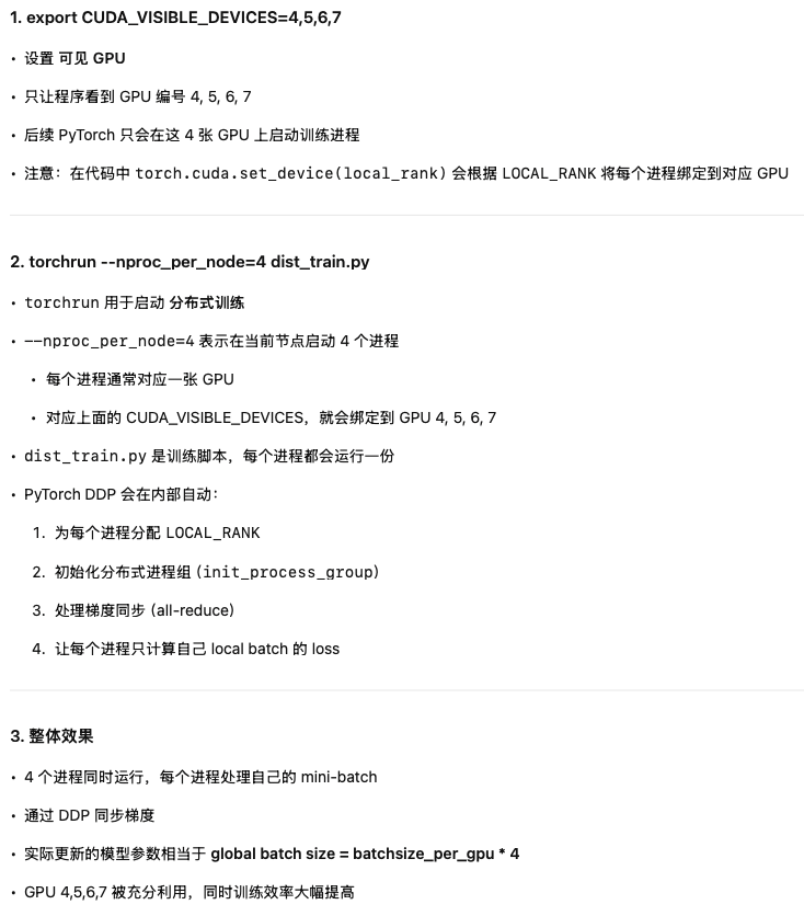 目前仅考虑单机多卡的情况,nproc_per_node 的全称是 "number of processes per node" ,意思是 每个节点(机器)启动的进程数量, 在分布式训练中,这通常对应 每张 GPU 启动一个训练进程,保证每个 GPU 都被占用并参与梯度同步。
