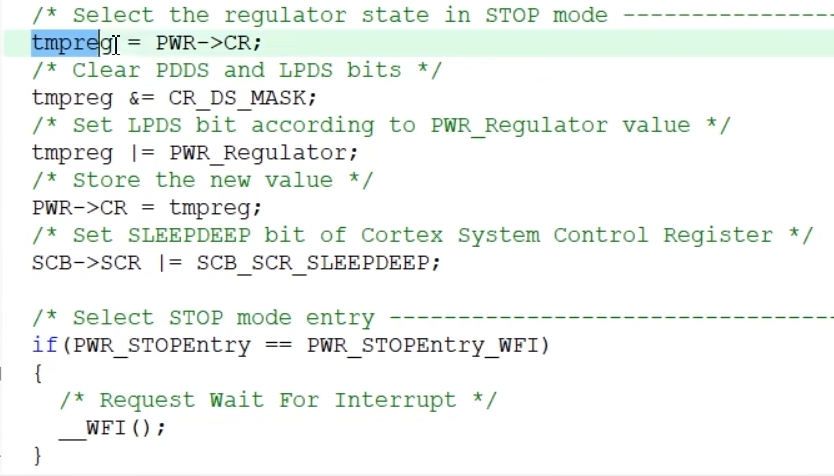这里我们选择WFI指令进入停止模式。那么这一段代码干了什么呢,我们可以看一下函数内部。
