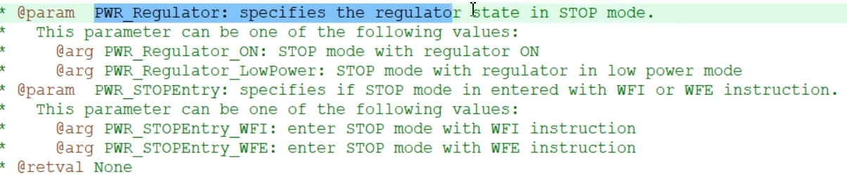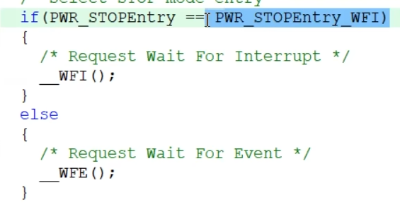 之后第二个参数是停止模式的入口参数。是选择WFI指令进入停止模式,还是WFE指令进入停止模式。