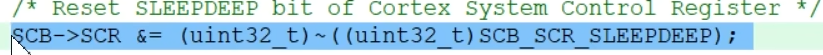 最后一行,就是停止模式唤醒之后,才能执行到。可以看到在退出停止模式后,他很贴心的把我们的SLEEPDEEP位清零了。