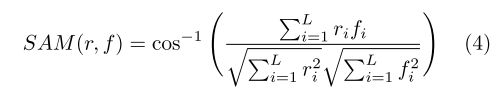 - 光谱角制图仪(SAM):它是表示融合图像和参考图像的向量之间的夹角[171]。它对每个像素进行计算,然后平均以获得全局光谱角。理想情况下,该值(全局光谱角)应尽可能小。由以下公式给出。